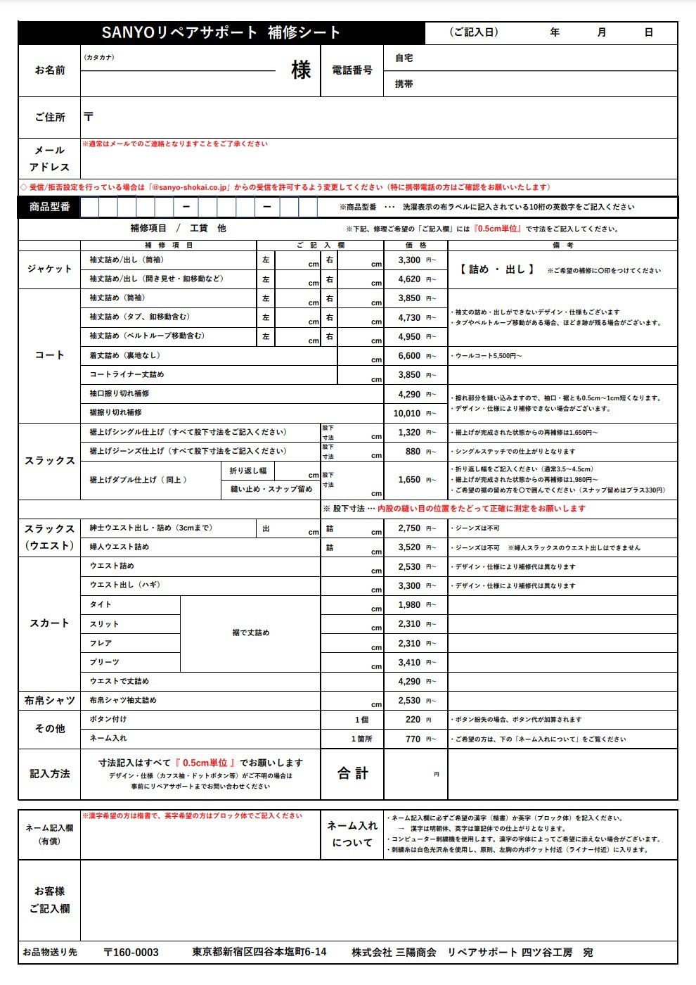 下記「SANYO リペアサポート 補修シート」のリンクからPDFをダウンロード・印刷し、内容を記載してください。