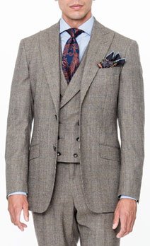 トレンドのブラウンをベースにブルーのオーバーペーンをアクセントにした英国調のミルド仕上げの3ピーススーツ。