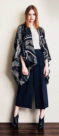 肩から上半身全体をカバー可能なマントで、大柄なペーズリー柄が人目を引き、これ1枚でスタイリングの主役となります。