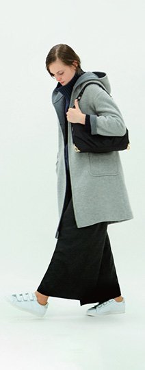 柔らかなリバー仕立てのフーデッドコート。膨らみのある素材を生かしたシンプルな一着です。抜け感のあるドロップショルダーと大きめのパッチポケットは素材とも相性が良く、さらりと着こなしやすい一枚仕立てのコートです。