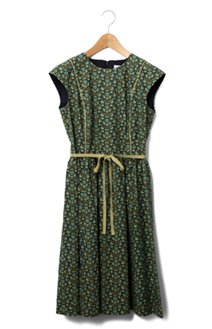 小花柄にグログランリボンでアクセントを加えたフィット&フレアシルエットのワンピース。トップス部分はプリンセスラインですっきりと、スカート部分は優しく広がるギャザーフレアでふんわりと、女性らしくスタイルアップして見せてくれる一着です。肩先を包み込むようなフレンチスリーブのデザインも上品なカッティングになっています。 一見クラシックな小花柄ですが、よく見るとデフォルメされた更紗模様のような雰囲気のあるプリントです。 ※家庭洗濯可能 ※アンダードレス付き