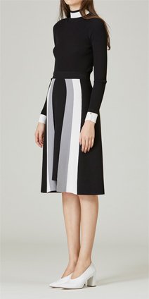 配色がポイントのニットのフレアスカート。前中心部分は2枚重ねで動きのあるデザインに仕上げてます。 ビスコースを使用した細番手のストレッチ強撚糸で編み上げたニット素材。シルクのように光沢があり、サラリとした質感です。