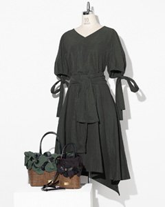 【デザイン】フロントの大胆な結びリボン、イレギュラーヘム、ミディ丈、フレアシルエットと今年らしい要素が詰まった一枚です(素材は同上)。4月、エポカで一番売上げた商品です。