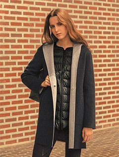 リバーシブルで着用できる1枚で様々な着こなしが楽しめるフーデッドデザインのシングルショートコート。素材は上品な光沢としっかりとした張り感が特徴のダブルフェイスの素材です。ダブルフェイスとは、両方が表になるようにはぎ合わせた生地の縁をスライスし、内側に折り込んで丁寧に縫い合わせた素材をいい、縫い代が嵩張らず、すっきりしたシルエットに仕上がるのが特徴。 同ブランド10月度売上着数ベスト2位、コートの中では売上着数1位の商品です。