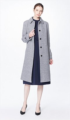 ざっくりとした風合いのバスケット組織で織り上げた素材を使用したステンカラーコート。ボリューム感がありながら、軽くて柔らかい風合いが特徴の糸を使用し、ランダムな杢調のカラーミックスを表現しました。特徴ある素材感を活かし、シルエットにこだわりデザインはシンプルに仕上げました。着丈は97㎝でスカートにもパンツにもバランス良く合わせていただけます。通勤からお出かけまで多くのシーンで着ていただける汎用性のあるコートです。 同ブランド11月度売上着数ベスト1位の商品。(11月16日付全国紙タブロイド版広告を掲載、効果大)