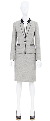 カルゼツィードを使用したパイピングディテールがモダンな印象のセットアップ(ジャケット本体価格¥83,000+税、タイトスカート¥43,000+税)