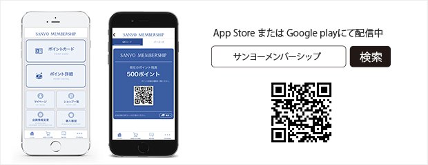 公式アプリ登場! 2017年5月17日 お知らせ SANYO MEMBERSHIPの公式アプリが登場しました! 店頭でのお買い物の際に、アプリをご提示いただくだけで簡単にポイントが貯められます。 ポイントカード カード画面ご提示でポイントが貯められるほか、ポイント残高もその場でご確認いただけます。 店舗情報 近隣の店舗をGPS機能を利用して探すことができます。 また、ショップの情報を見ることもできます。 WEB STORE アプリからSANYO iStoreでお買い物もできます。