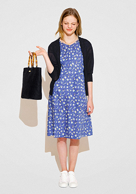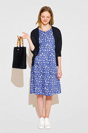 水をはじきやすい加工を施したフラワープリントワンピース。ウエストから裾にかけて程よいフレアーのシルエットで雨の日でもワンピーススタイルが楽しめます。家庭での手洗いが可能なため、梅雨の時期から暑い夏にかけて重宝する1着。1枚でもコーディネートが完成するので蒸し暑い日のおしゃれにお勧め。 ※5月24日より発売中
