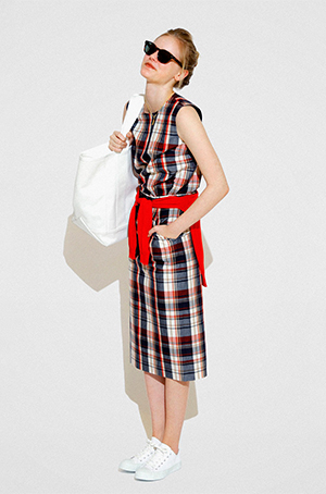 水をはじきやすい加工を施したチェックのブラウスとタイトスカート。セットで着るとワンピースの様に着こなすことができ雨の日でもおしゃれが楽しめます。家庭での手洗いが可能なため、梅雨の時期から暑い夏にかけて重宝するアイテムです。 ※5月24日より発売中