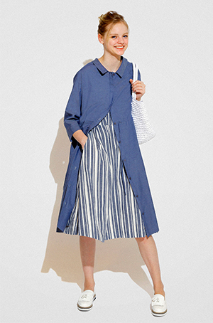 ラグラン切り替えのドルマンスリーブシャツワンピース。ローブ風のシルエットでシンプルなデザインです。はっ水加工を施した素材で、雨の日の軽やかな羽織りものとしても重宝する1枚です。家庭での手洗いが可能です。 ※5月24日より発売中