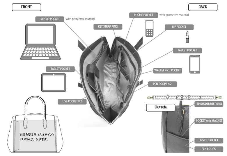 | (2) 必要な物が収まるポケット、自立するデザインなど機能を装備 | <ポケット> ・前面内ポケット ・後ろ面内ポケット ・外面ポケット <サイズ> <自立するデザイン> <取り外し可能ロングショルダー> |