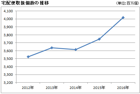全国の宅配便取扱個数は、EC市場の拡大に伴い、2012年の35億2千6百万個から4年後の2016年では40億1千9百万個と約14%もの増加となっています。また、2016年の調査結果では、その内の約2割が再配達となっており、二酸化炭素排出量抑制や労働力不足対応の観点から、物流効率化の推進が社会的な課題となっています。