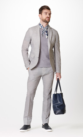 | ライトグレーのセットアップに同系色のカットソーを合わせてトーン・オン・トーンの色合わせでコーディネート。全体がぼやけないために、ネイビーのメッシュスニーカーと大判のチーフを巻いてアクセントをつけ、カジュアル度が高い通勤スタイルを表現しています。 |