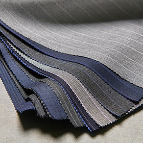| 素材の種類 | 表地 | 約30種類・・・・毛100%を中心に、欧州を主としたインポート生地、及び国内生地。 色は紺、グレー、黒をベースとしたストライプ、無地が中心。 |