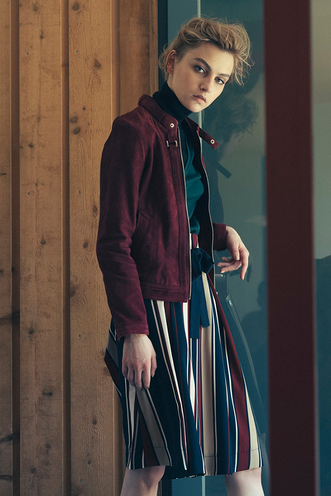 キーカラーはバーガンディ。別注で染め上げたしなやかなスウェードにレジメンタルストライプを合わせた、クラシカルでモードなLOVELESSのスタイリング。