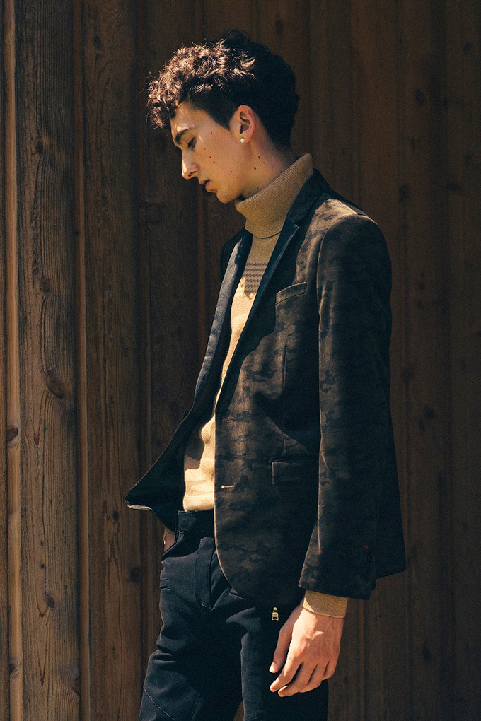 ドレッシーなベルベットを迷彩柄でくずし、インナーも迷彩柄で合わせるパターンオンパターンのスタイリング。