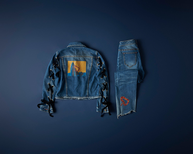 中でも、Gジャンとデニムパンツは、MOTTYのディレクションによって生まれたSpecial Productです。デザインとして袖や裾にレースアップや切りっぱなしの加工を取り入れ、今回のアートの象徴であるsnakeアートをバックにプリント。