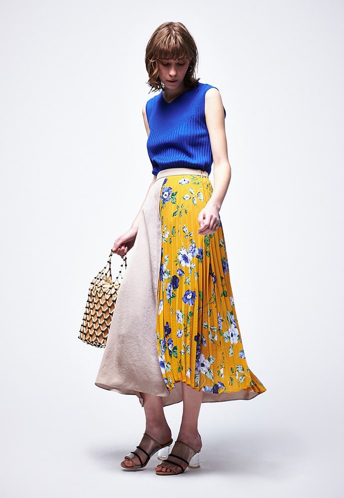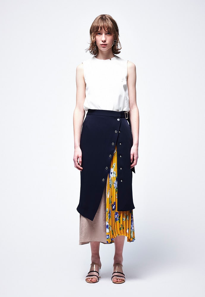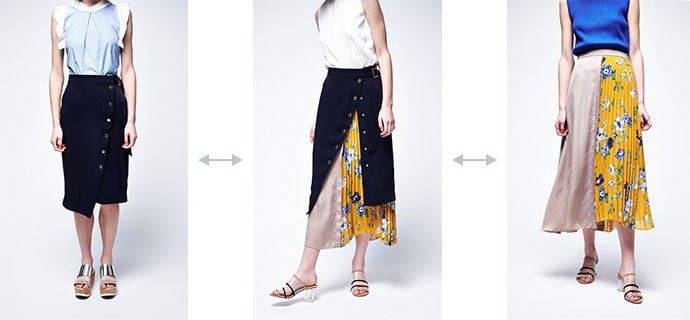 ラップスカートとプリーツスカートがセットになったレイヤードスカート。それぞれ1枚でも履けるので、3通りの着回しが可能。外側はアシンメトリーのラップスカート。フロントボタンの開閉具合により印象チェンジできます。内側は、プリーツをかけた花柄のプリント生地と無地を切り替えたマキシスカート。柄の面をどこにするかで見え方が変わります。着回しと着こなしが楽しめる、旅行に持っていけば活躍度抜群の3WAYスカートです。