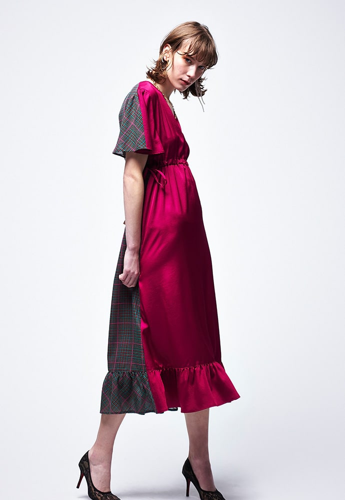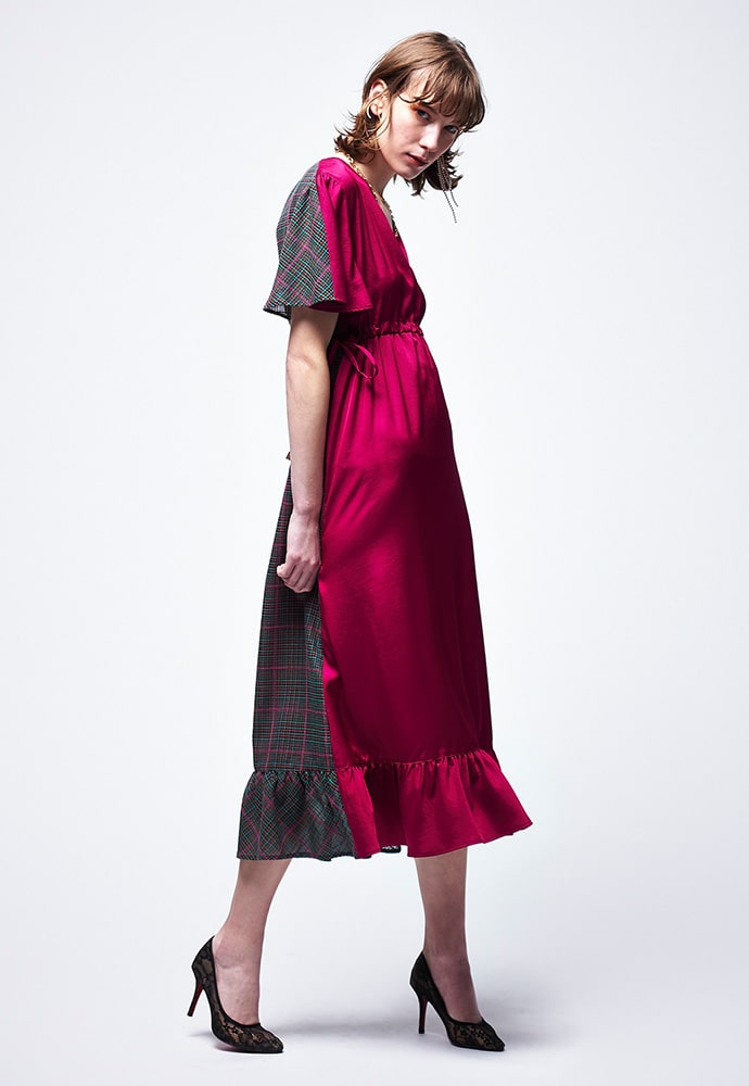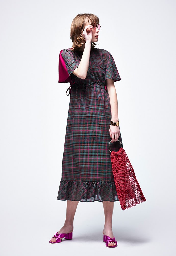 チェック柄素材と光沢感のあるシルキー素材を配した前後で着用できる2WAYサマードレス。旅行先で気分やシーンに合わせて雰囲気を変えることができます。ネックラインにもこだわり、チェック柄面を前にすると可愛らしいクルーネック、シルキー素材面を前にするとカシュクールで女性らしい印象にと素材のイメージに合わせたデザインです。ウエストが絞れるドローストリング仕様のため体型や好みに応じて調整が可能。マタニティードレスとしてもお召しいただけます。旅行先のリゾート着としてリラックス感のある装いから、レギンスを合わせたトレンド感のあるレイヤードスタイルまでお楽しみただける1着。