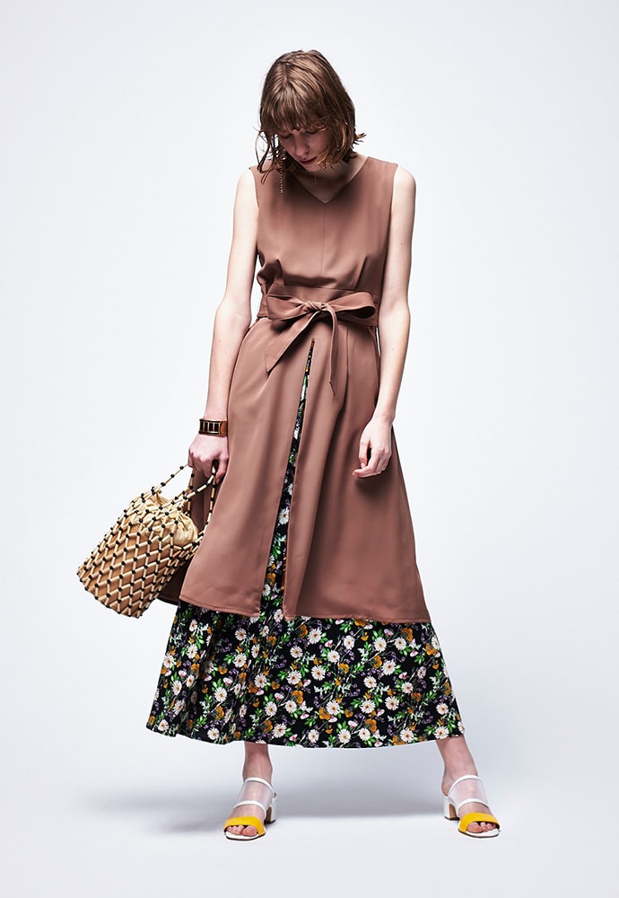 1つで4通りの着回しができるレイヤードドレス。ワンピースの本体にフラワープリントのスカートを付属しており、旅行先で気分やシーンに合わせて雰囲気を変えることができます。