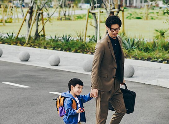 シーン3.<出勤前の登園で> → 動きやすく天気に左右されない装いでイージーケアも兼備