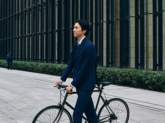シーン4.<自転車通勤で> → 軽やかな着用感と折り畳んでも安心な防シワ性