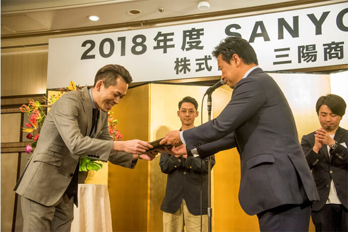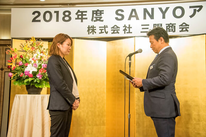 当社は、自社の販売員(以下、FA=ファッションアドバイザー)のスキルやモチベーションアップと社内コミュニケーションを目的として、FAの功績を称える「全国優秀販売員表彰式」を1986年より年1回開催してまいりました。昨年度よりこの表彰式の名称を「SANYOアワード」と改め、ものづくりに関わる企画部門を対象とした「プロダクト部門」も追加し、拡充を図っています。