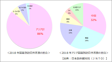 2018年には過去最高の3,119万2,000人(前年比8.7%増)を記録したインバウンド客数において、アジア圏内からの訪日外客数は全体の86%を占め、さらにアジア圏内における中国からの訪日外客数の割合は32%と、中国からのインバウンド需要が非常に高く、今後2020年に向け更なる需要増加が見込まれています。