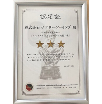 サンヨーソーイングは、IACDE(国際衣服デザイナー・エグゼクティブ協会日本支部)から2019年度「国内縫製工場優秀三ツ星工場」の認定を受けました。