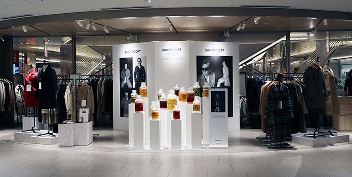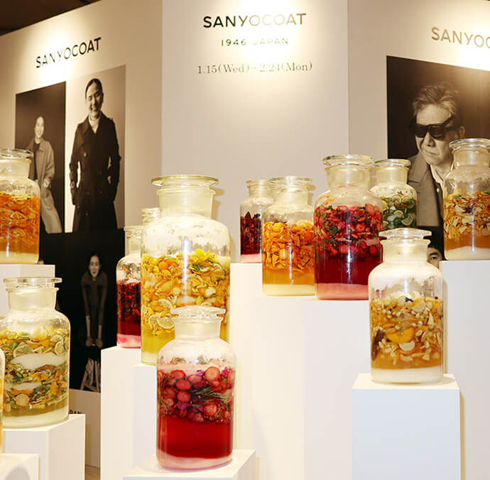 店装のイメージビジュアルにはモデルに限らず各業界の著名人を起用。写真を通して、その人生が滲み出る人々をキャスティングし、様々な人生の背景とコートを重ねて感じてもらえるようなポートレートを展開します。ポートレートにも登場するフラワーアーティスト壱岐(いき)ゆかり氏による装花のインスタレーションも展示。カラフルな色の装花やフルーツが入った酵素・漢方シロップ入りボトルフラワーで、生花より長く鑑賞できることが特長です。