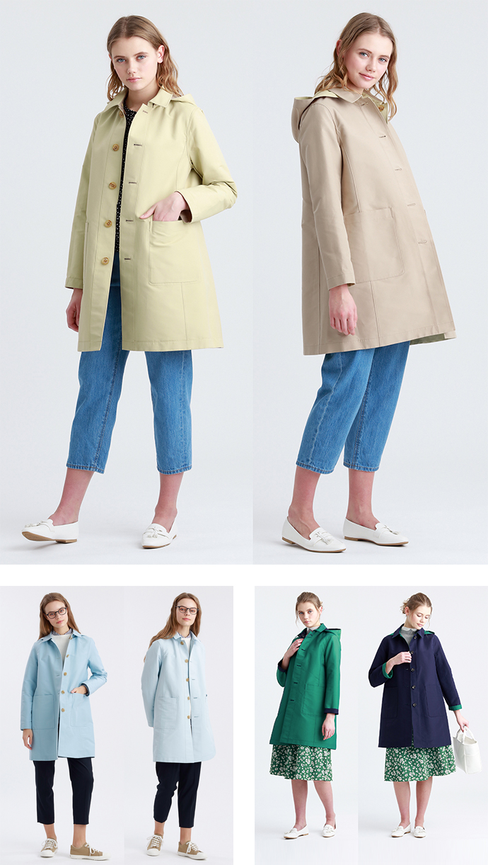 2020年においては、18型全てにはっ水性を持たせたことをはじめ、1着で異なるカラーの両面が着用できるリバーシブルコート、着脱可能なライナーを付けることで長い期間着用できるコート、着丈が短めのブルゾンタイプ、家庭での水洗いを可能にしたウォッシャブルコート、通勤スタイルに合わせやすいステンカラーコートなど、着用する時期とシーンにあわせ、幅広いファッションテイストのお客様にマッチする商品を提案いたします。
