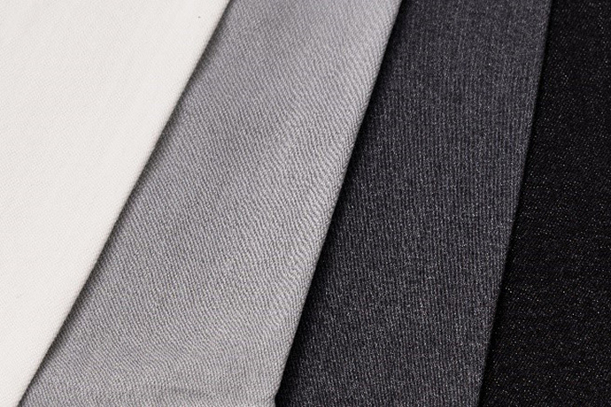 ブラック・ホワイト系はブラック、チャコールグレー、ライトグレーと、ホワイトの4色を展開。ブラックは工場独自のノウハウにより、深い青みのある色に染め上げています。ホワイトはタテ糸とヨコ糸の密度を微減することで、ソフトな風合いをもたせています。