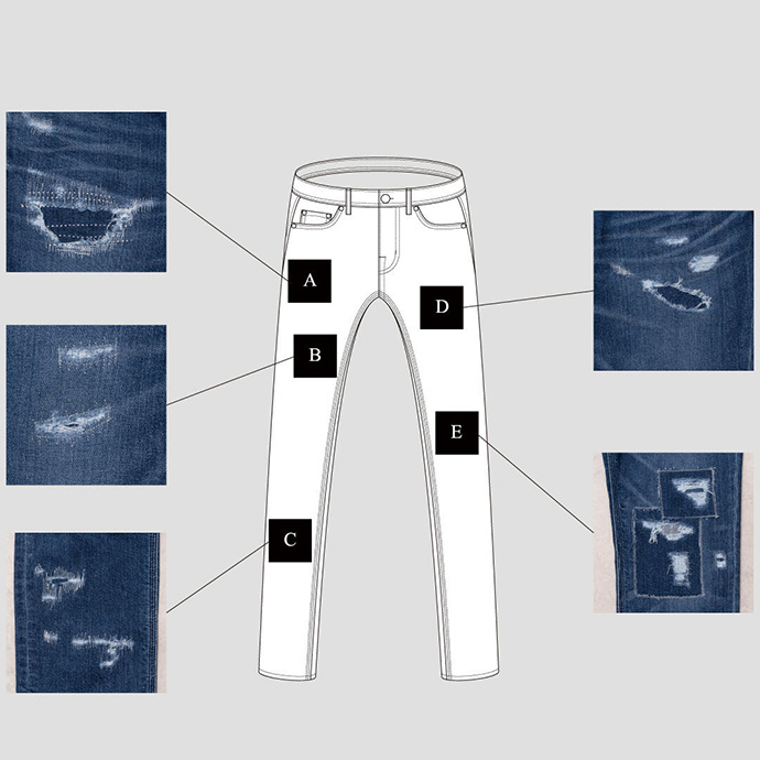 7種類のデニム生地、5か所のダメージ加工の有無、3種類の革パッチのカラーをカスタマイズし、"自分だけのオリジナルな1本"をオーダーしていただける企画 ※ダメージ加工・革パッチは「無し」の選択可能 |