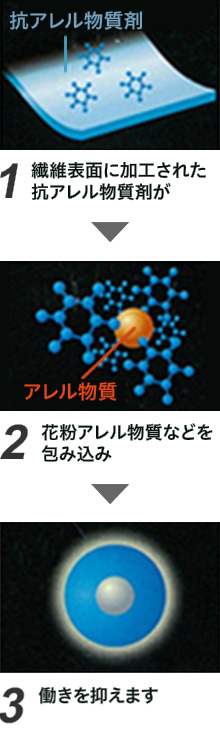 花粉やダニなどのアレル物質の働きを抑制する「抗アレル物質特殊加工剤」を特殊技術によりナノスケールで繊維にコーティングした素材です。