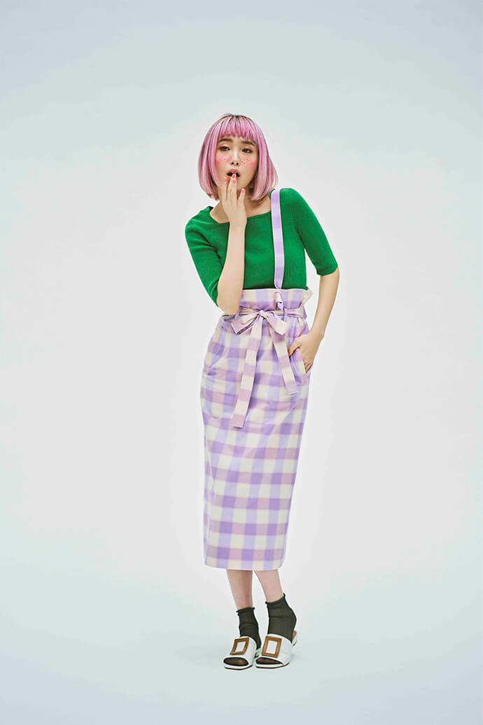 「直感って、言葉を超えたロジックだから。」そう語る彼女のハッピーなギンガムチェックのスカートの、肩から吊るすストラップが片方しかないのも、何か論理があるのかもしれない。あるいは、ないのかもしれない。