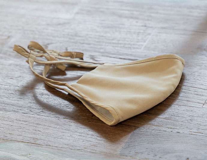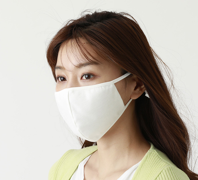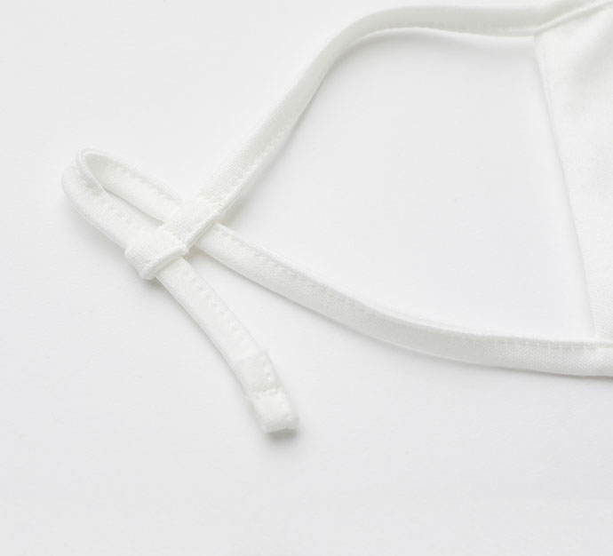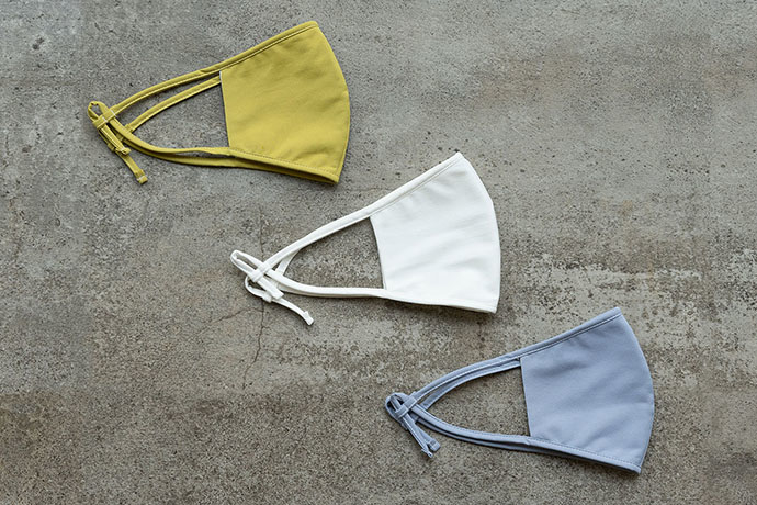 第1弾のマスクは、立体裁断に加え、紐はアジャスター機能を付け幅広くサイズ調整ができるようにし、フィット性の高さを実現しました。マスクの内側にはダブルガーゼを使用。シーンを選ばず着用できるよう、無地でシンプルなデザインにし汎用性を高くしました。布製なので繰り返し洗って使用できます。国内工場での厳しい品質管理の下、生産しています。