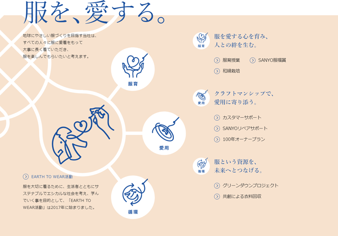三陽商会は、 2019年にサステナブルアクションプランの総称を「EARTH TO WEAR」とすることを決定し、サステナブル経営のさらなる推進を目指しています。このアクションプランは、SDGsの目標12:「つくる責任、つかう責任」を念頭に、つくる責任にあたる部分を「地球を、愛する。」、つかう責任にあたる部分を「服を、愛する。」として2つのカテゴリーに分け、自社が特に寄与できるもの、推進していくべきアクションで構成しています。今回の取り組みは、このアクションプランにおける「服を、愛する。」の中の「服育」に関する活動の一環となります。