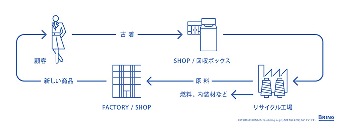 日本環境設計株式会社が運営する「BRING」は、繊維製品を地球の資源へとリサイクルするために、様々な企業同士が連携し、お客さまと一緒になって取り組むプロジェクトです。プロジェクトの参加企業は、お客さまが店頭などに持ち込んだ繊維製品を回収し、服の原料や自動車内装材などにリサイクルします。