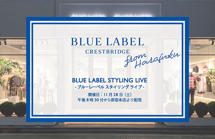 お手持ちのスマートフォンやPCにてブランド公式サイト上の指定のURLから無料でご視聴・ご参加いただけるライブ配信となっており、初回である11月28日の配信では、「ブルーレーベル・クレストブリッジ」のスタッフより原宿本店の店舗紹介をはじめ、この冬おすすめのコートアウターやスタイリング、ギフトアイテム等をご紹介いたします。