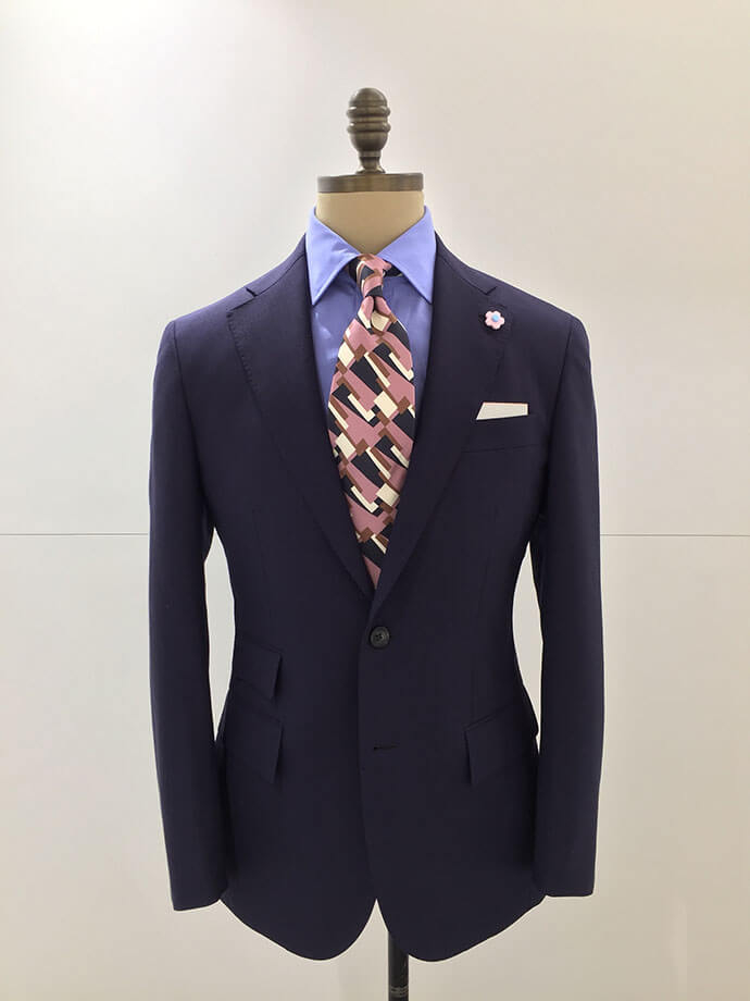・チェンジポケット付きのデザインでサイドベンツの仕様になっています。また、背抜き仕立てにすることで清涼感をもたせました。