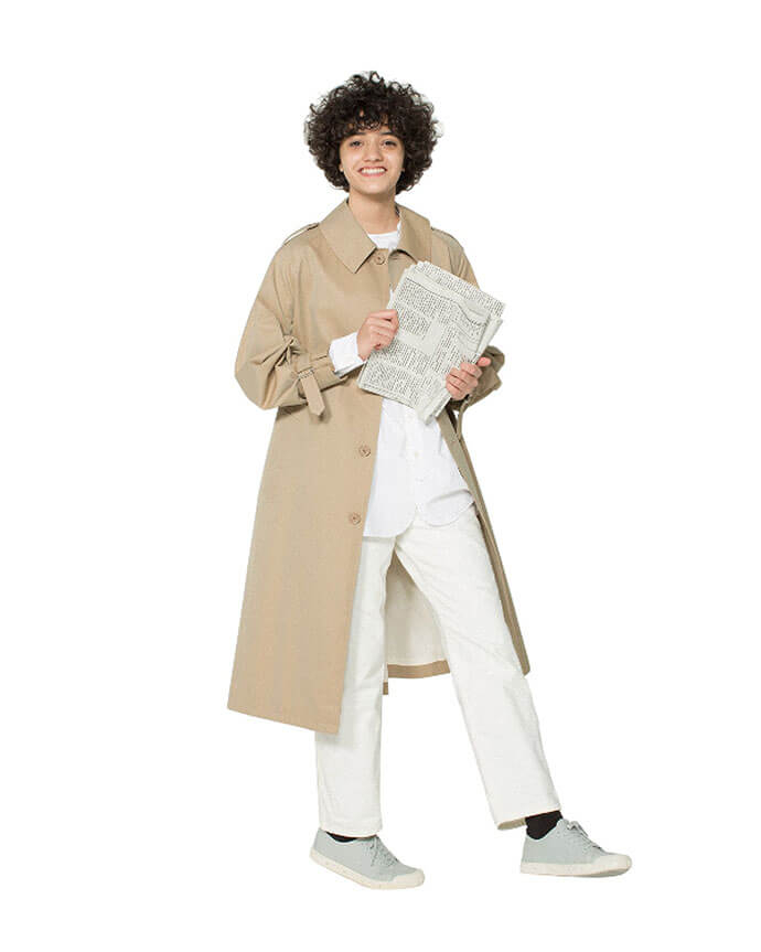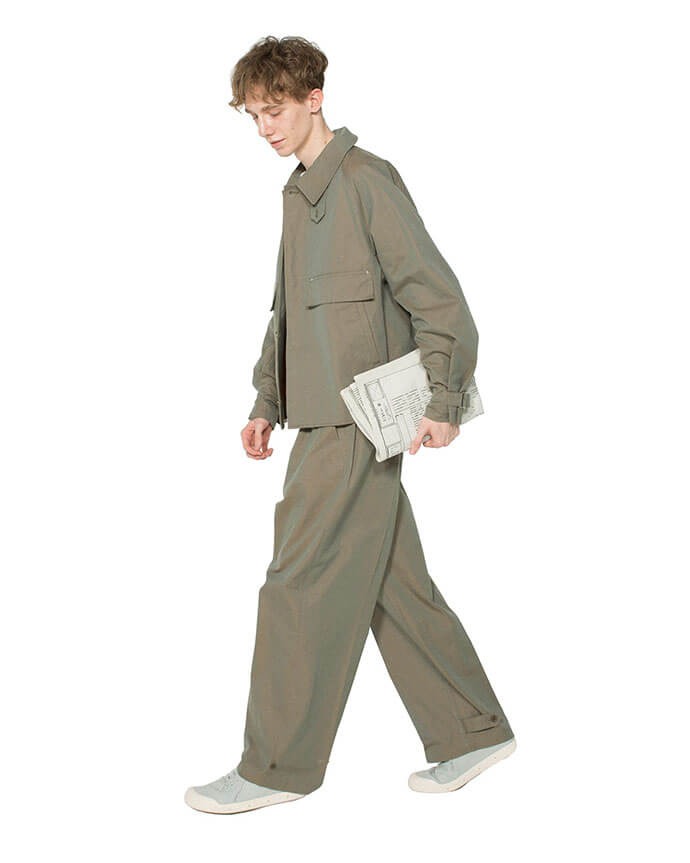 コートとジャケットは、特徴的な丸みのある衿、肩周りをコンパクトに見せるラグランスリーブ、袖口を絞ってブラウジングできるスリーブタブがポイント。パンツは、ウエストのバックル付き共地ベルトがデザインポイントになっています。