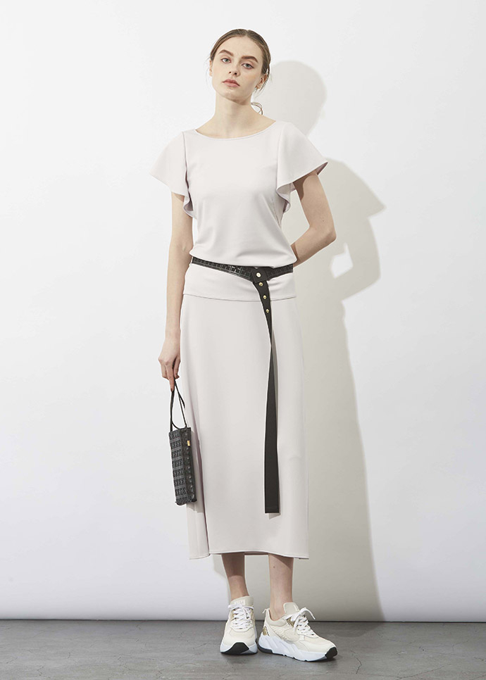 スリット入りで動きやすいコンフォータブルスカート。付属のベルトをすることでシンプルなデザインのアクセントになります。