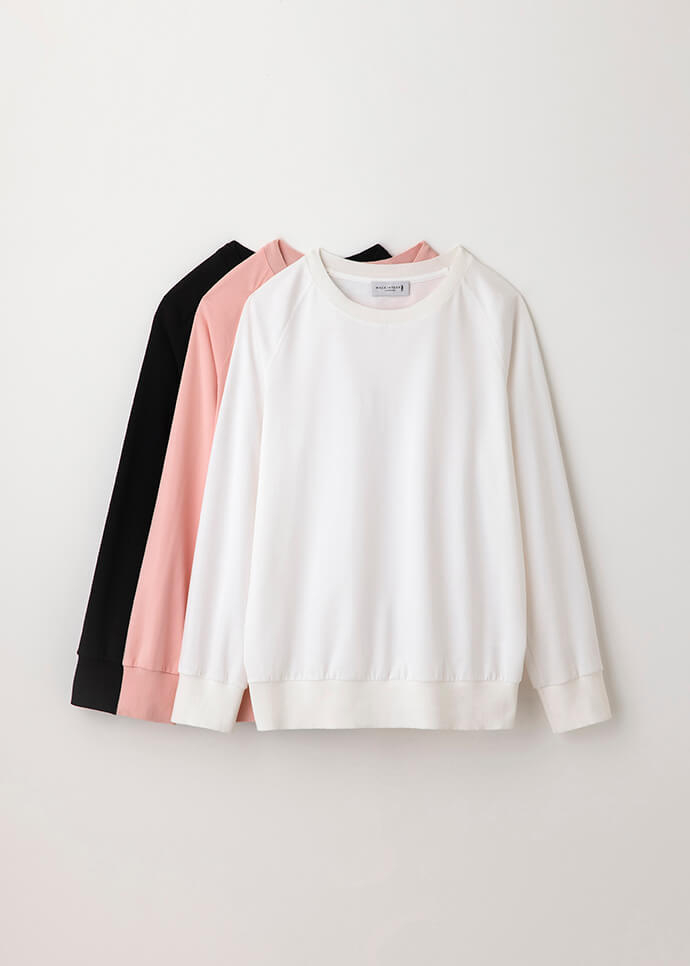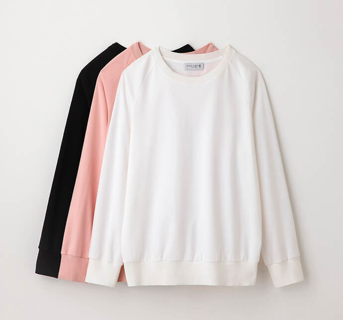 ハイゲージで仕立てたベーシックな薄手トレーナー。衿や袖にはリブを付け、トレーナーディテールを丁寧に仕上げているため、⼤⼈の⼥性が⼀枚できれいに着られる⼀着です。デイリーウェアとして、リピートするのに好適。