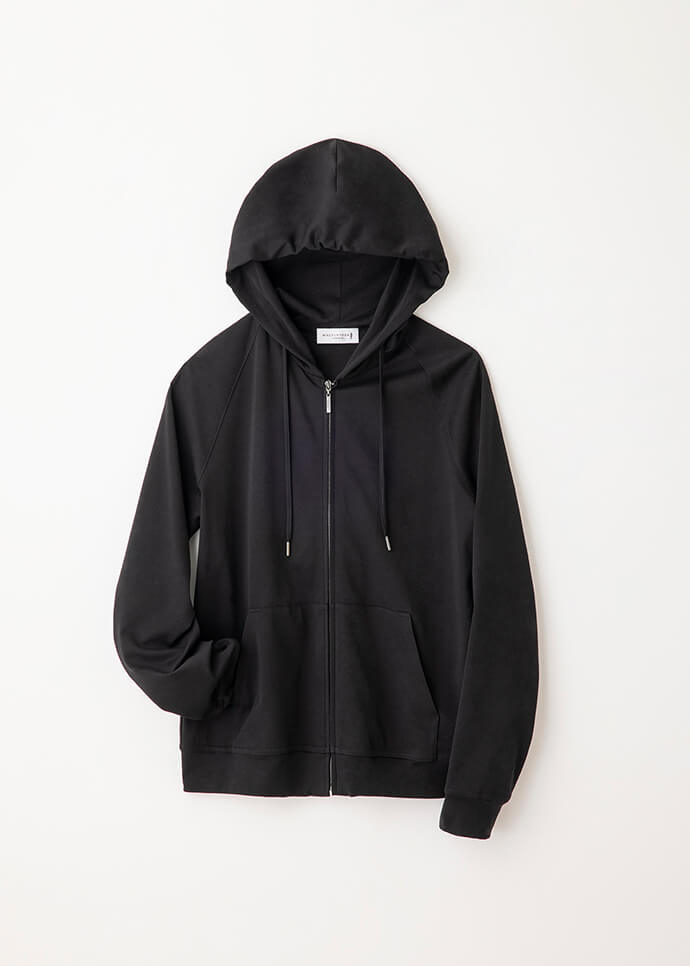 シンプルながら存在感のあるパーカ。肌当たりが良いように接ぎの部分の仕様までこだわって丁寧に作りました。室内や屋外で軽い⽻織ものとしての着⽤はもちろん、薄⼿でコンパクトなサイズ感のためコートやジャケットのインナーとしても重ね着がしやすく、フードを垂らしてモード感のあるコーディネートになります。同素材のパンツとのセットアップのスタイリングも出来る商品。