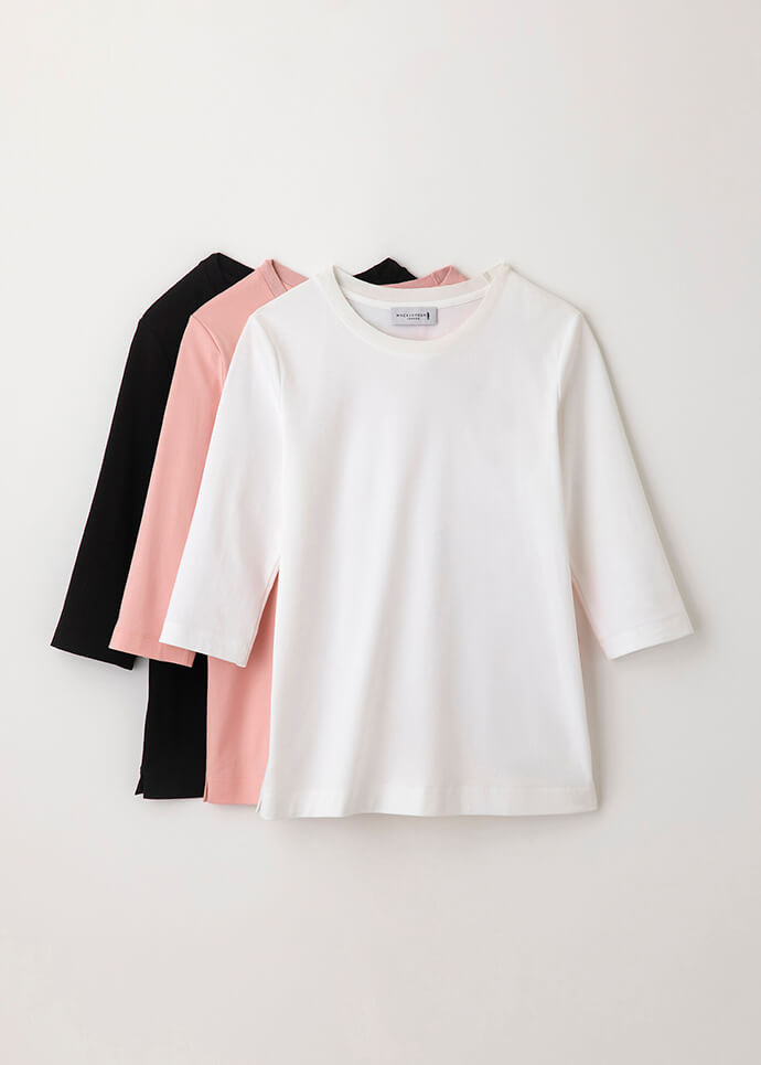 ハイゲージで仕⽴てたカットソー。肘まである袖丈なので、春から秋までロングシーズン活躍します。⼀枚での着⽤はもとより、シャープなシルエットのためジャケットやカーディガンのインナーとして着用しクリーンな装いができます。