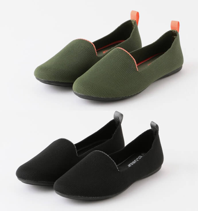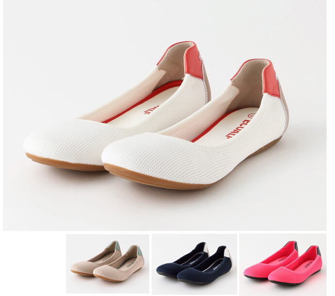 インソールには工業製品などに使われてきた合成ゴム素材を使用し、バレエシューズでありながら衝撃を吸収するクッション性の高さが特徴。甲を深めに覆い長時間歩いても疲れにくいデザインです。超軽量設計のため履き替え用シューズとして持ち運ぶのにも重宝する一足。