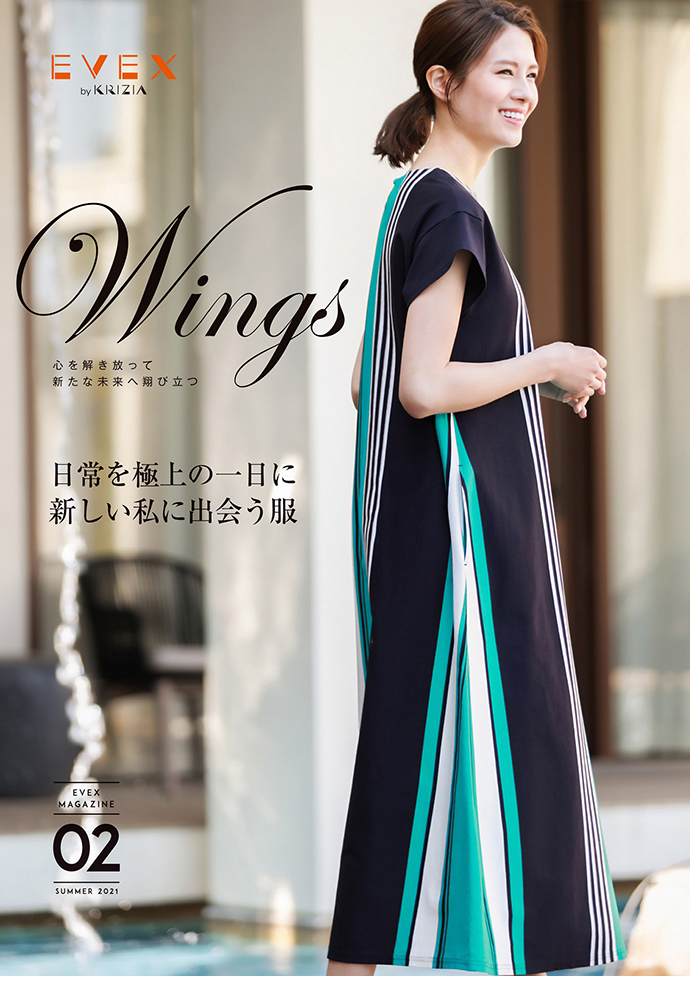 今回「EVEX by KRIZIA」がコロナ禍の中でお客さまの"買いやすさ"を考えて制作した『Wings vol.2』は、A4版8ページ構成の電話注文ができるファッションマガジンです。外出が制限される状況においても、EC購入が苦手な方でもオンラインだけでなく電話で気軽に注文できることが一番の特長です。5 月展開の夏物商品を中心に、気持ちが華やぐ色・柄ものや接触冷感素材のアイテムなど、大人の女性がスタイリッシュに心地よくいられるアイテムを掲載しています。