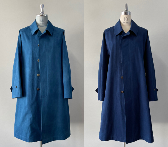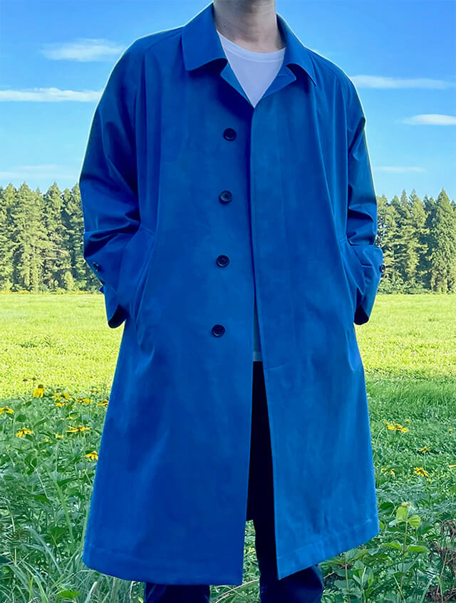 「本藍染コート」は、「サンヨーソーイング」の特徴の一つであるステッチ(縫い目)の美しさを生かせるように、藍染めで一般的な製品染めではなく、均一に染まるよう1着分の生地を染めてから裁断・縫製してつくります。表地は藍染めをした際に色が映え、かつ染料をなじませやすい狭巾で淡色の綿ギャバジンを厳選し、4mの着分を手作業で、染め・すすぎ・乾燥の工程を複数回繰り返し染め上げます。