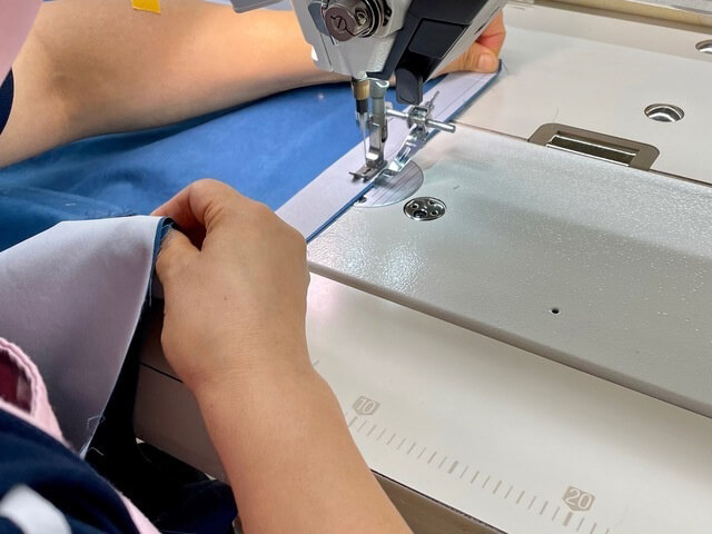 その縫い縮みを見込んで、鍛錬された力加減で生地を両手で前後に引っ張りながらミシンをかけると縫い目が真っ直ぐに、かつ生地表面が歪むことを防ぐことができ、仕上がりが美しくなります。