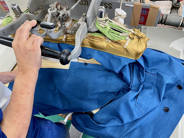 コート生産における最後の仕上げは一枚一枚職人の手によっておこなわれます。完成したコートの仕上がりを確かめながら、熱、蒸気、温度を調整しながら裏からアイロンを当て、生地の風合いを損なわずに細かい部分まで仕上げプレスを施します。